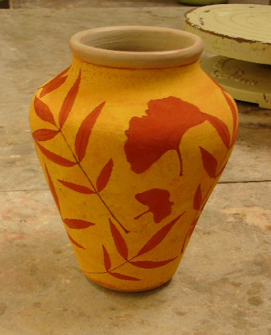thrown and trimmed, it was coated with a layer of underglaze (the darker
